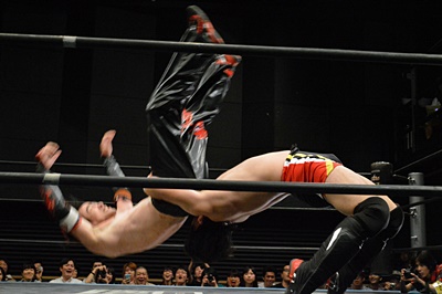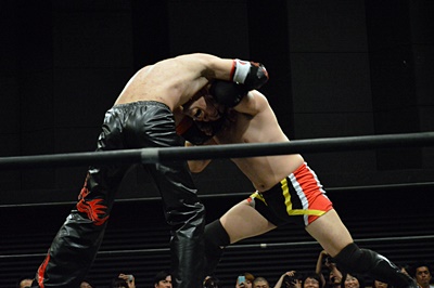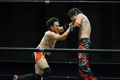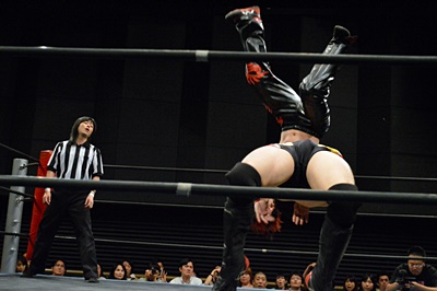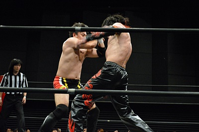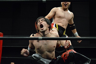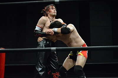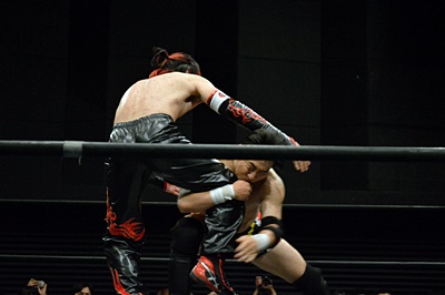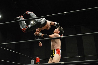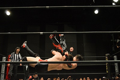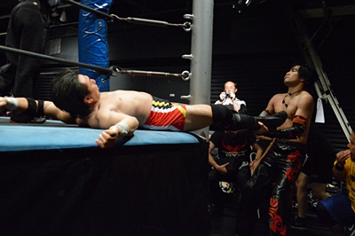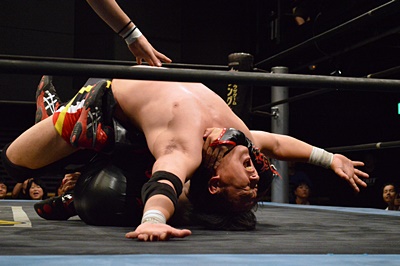 FUMAブレーンバスター狙う、イサミブロックして逆にブレーンバスター(左写真)。10分経過。