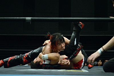FUMA切り返して片エビ固め(右写真)、カウント2。