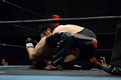FUMAボディスラム、コーナーに上る、イサミ起き上がると真・昇竜拳(右写真)。