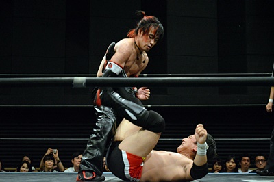 イサミコーナーに振って串刺しエルボー、再度対角線を走って稲妻脚(右写真)。