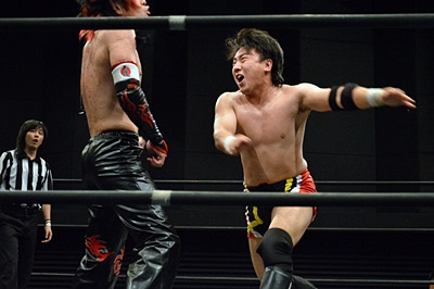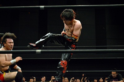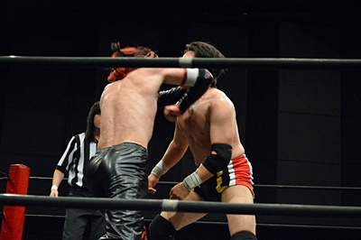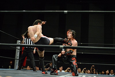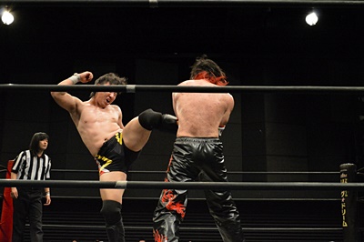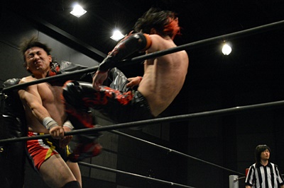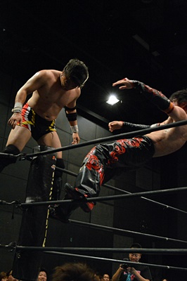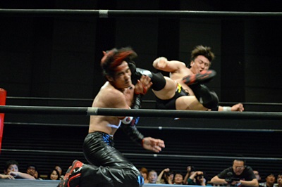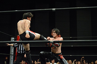 FUMAロープに飛んで顔面ドロップキック(右写真)。イサミ場外エスケープ、FUMAエプロン走ってキック、今度はヒット。