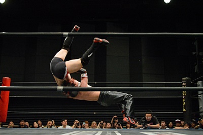 コーナーに上ってダイビングクロスボディ(左写真)、