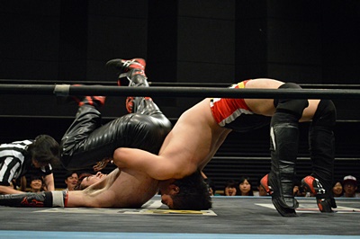FUMA切り返す、イサミ切り返して片エビ固め(左写真)、カウントは1。