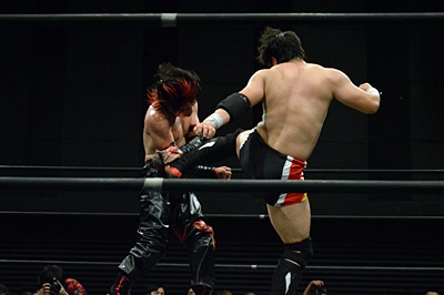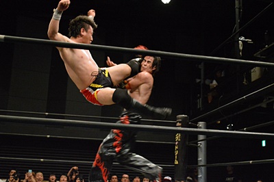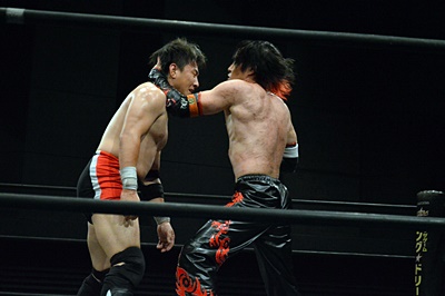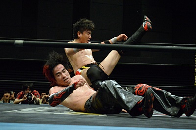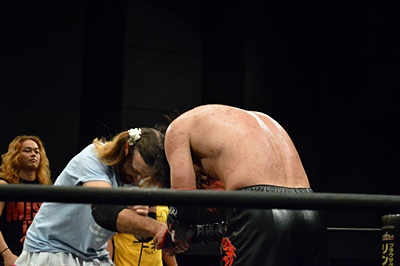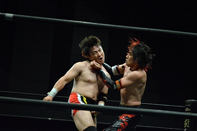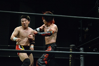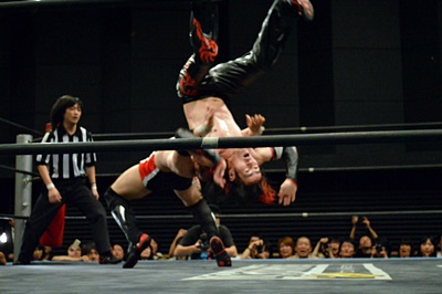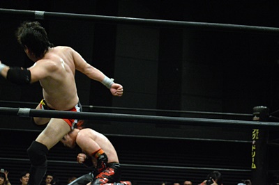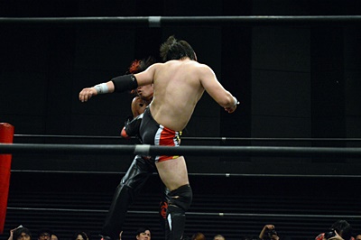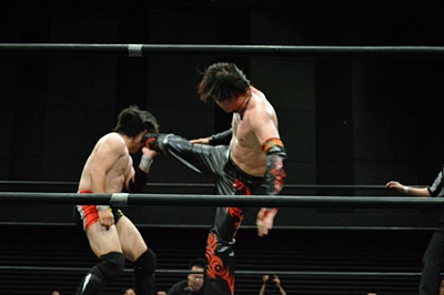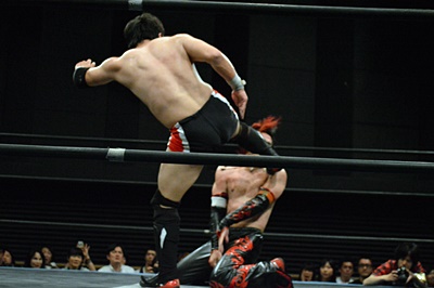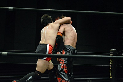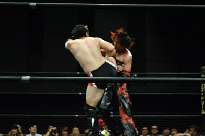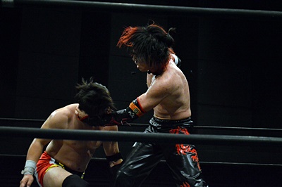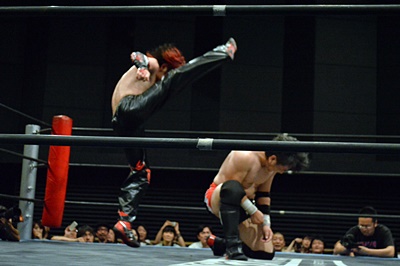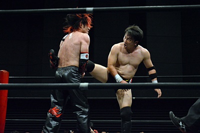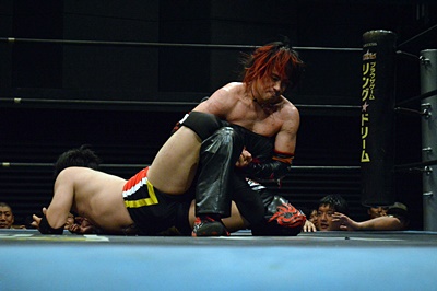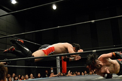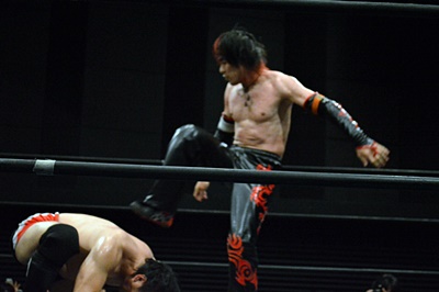 FUMAイサミを突き落すとダイビングヘッドバット、イサミかわす(右写真)。