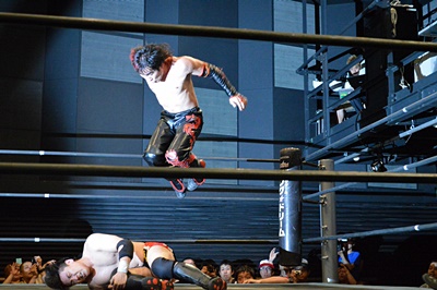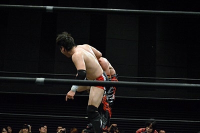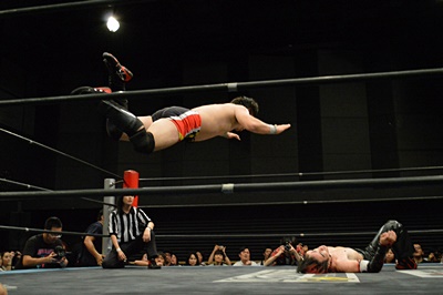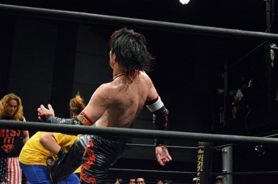 イサミコーナーに上ってFUMAの足へのダイビングダブルニードロップ(左写真)。垂直落下式ブレーンバスター、FUMA1で返す。
