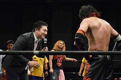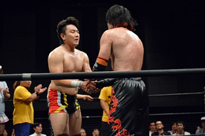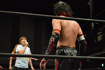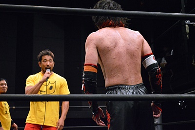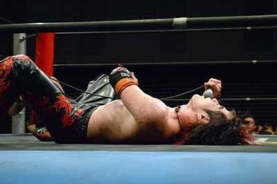 イサミ寝っ転がったまま「強い!思ったよりずっと強かった。キツイ!いいね。いいつばぜり合いだったね。楽しかったよ。いい刀持ってるんだから磨くもよし、磨いてから使うもよし、それはFUMAというプロレスラーが決めることだから。正直、俺がお前の頃は何もなかったよ。ただ突っ込むだけだった。君にはいい刀があるじゃないか。何で使わないんだよ?今日みたいにバンバン刀抜いてまたやろうぜ!」(左写真)