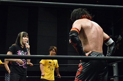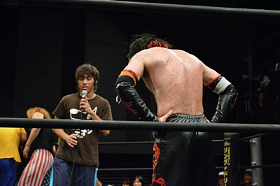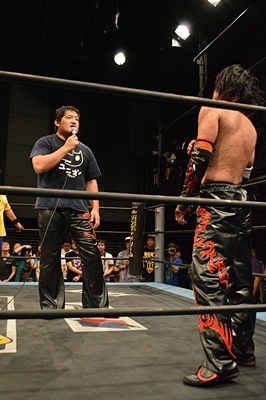 河村「イサミさんは尊敬するユニオンのレスラーです。両国では勝ってください。お願いします。」(右写真)