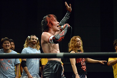 DDTの大一番・8/17両国大会のメインに臨むイサミにユニオン戦士から一人ずつメッセージが贈られる。出陣式かあ。まず石川が「両国大会、ベルトをユニオンに持ってきて。俺も光留からベルトを奪うから2本のベルトをユニオンに掲げよう。頑張って。」(左写真)。