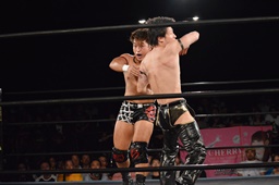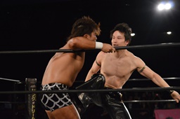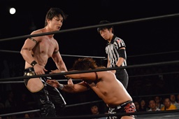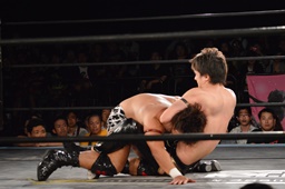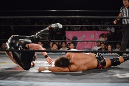 後頭部にニーアタック(左写真)。三富が尋常でない痛がり方。首に古傷抱えてんだっけ?