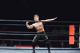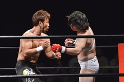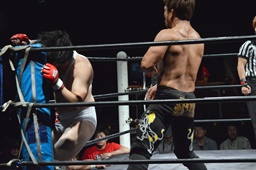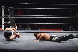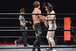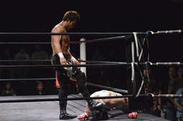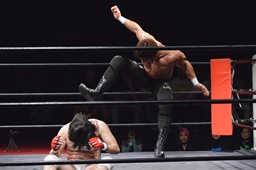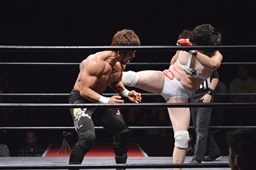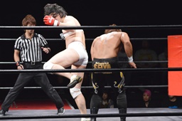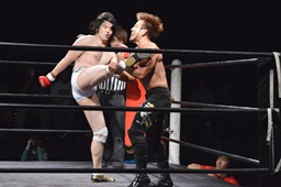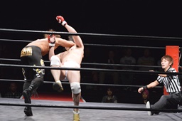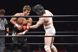 諸橋クリップラークロスフェース(左写真)、シバター切り返す。両者立ち上がる、諸橋突っ込む、シバターカウンターのフック、諸橋ダウン、シバター片エビ固め、カウント3。えーーーーーーーー!!!!
