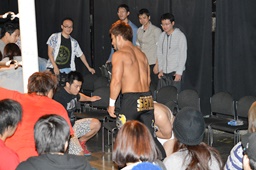 諸橋ゴング前に先制のラリアット、場外に出して客席に投げ込み(左写真)イス攻撃。