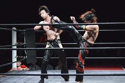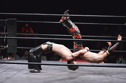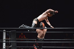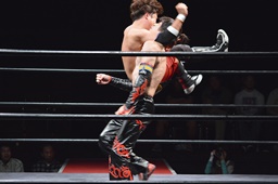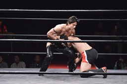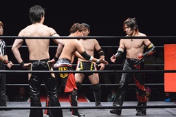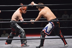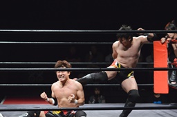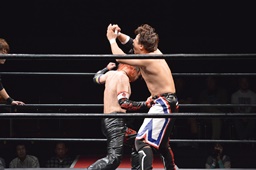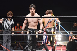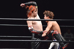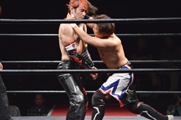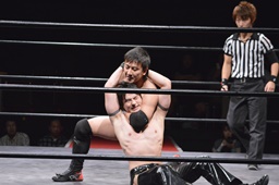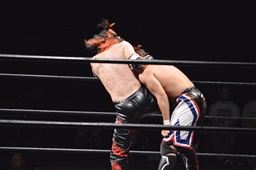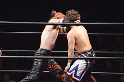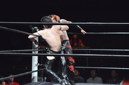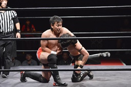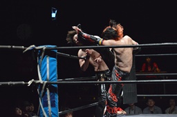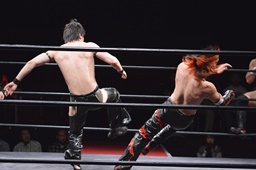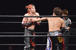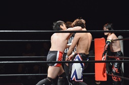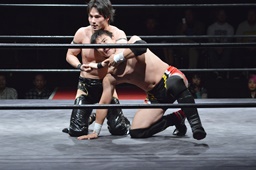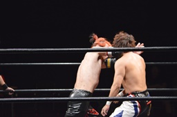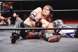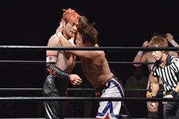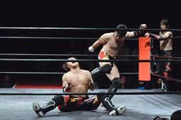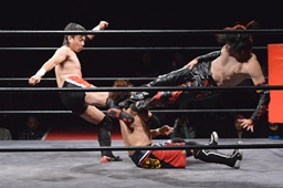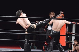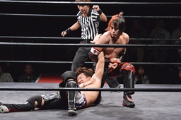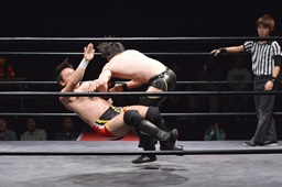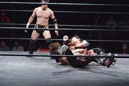 ワキ固め(右写真)、風戸ロープ。イサミはFUMAにタッチ。FUMAボディスラム、カウント2。イサミにタッチ。イサミボディスラム、カウント2。
