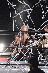 FUMAロープに振る、円華ショルダーブロック(左写真)。ロープワークからFUMAがキック、円華場外エスケープ。イサミと風戸がリングイン。