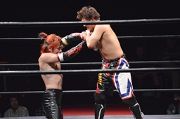 FUMAのサッカーボールキックとイサミのドロップキックでサンドイッチ(右写真)、カウント2。