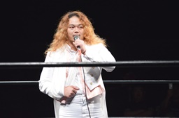 花道に置かれたイスに腰掛ける福田。その横を第1入場者のイサミが通る(左写真)。
