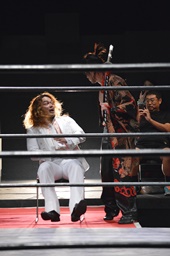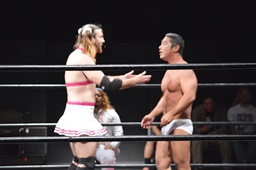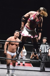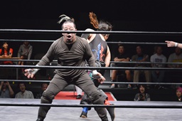 第8入場者のレディ・ビアードはクローズライン連発(左写真)、イサミにはトラースキック。