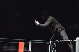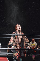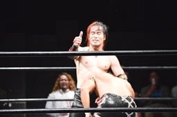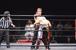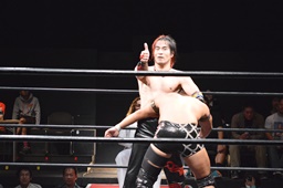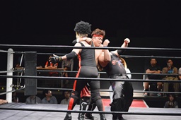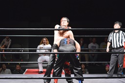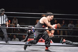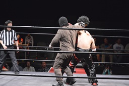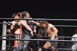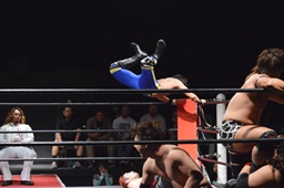 イサミはロープ越しに河村を捕らえ、場外へのパーフェクトプレックス狙う(右写真)、河村必死にブロック。