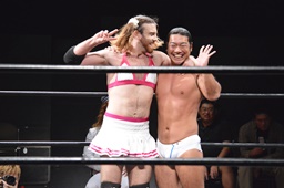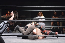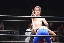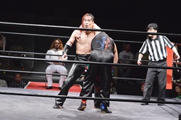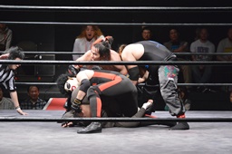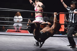 ゴローJrは2人の両腕を絡ませると2人まとめて逆さ押さえ込みに(右写真)、カウント2。