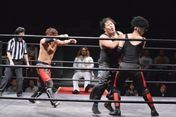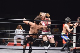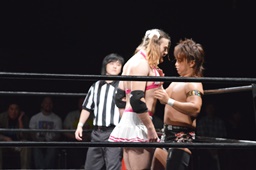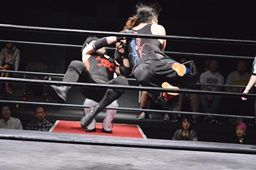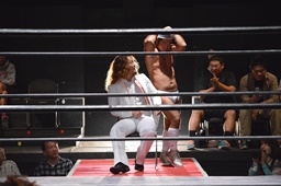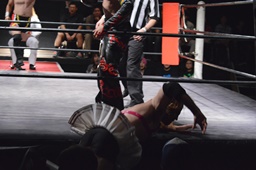 河村コーナー下にセットするとリバーススプラッシュ(左写真)、カウント2。イサミ場外エスケープ。