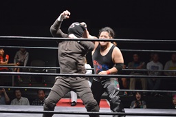 第2入場者は謎覆面J(左写真)。イサミvs謎覆面Jで開始。