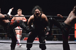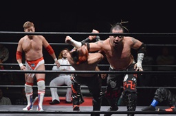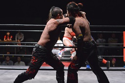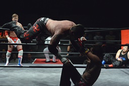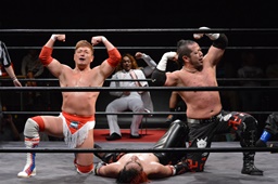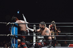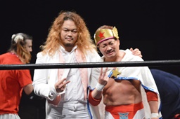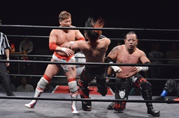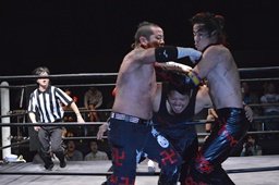 テイオーと葛西はイサミをロープに振ってダブルのショルダーブロック(右写真)、