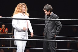 細身は福田と一緒にリングイン、「私はレスラーではないからリングで闘うことはできない、しかし文字通りあなたの(折れた)右腕となって歌で闘う。」(右写真)