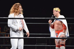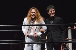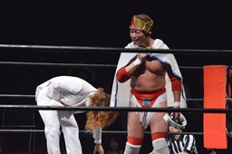 2人で「Mr.Perfect福田洋のテーマ」を歌う(左写真)。歌い終わると細身のシャイボーイはトップロープを越えて本部席に戻り、「細身のシャイボーイ、失格。」