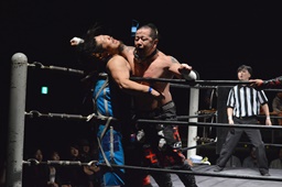 イサミエプロンにとどまる、葛西が突っ込む、イサミはロープを引き下げて葛西もエプロンに(右写真)。
