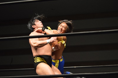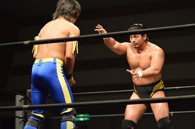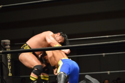 宮本ヘッドロック(左写真)、河村ロープに振る、宮本ショルダーブロック。