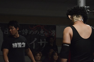 ゴローJr入場するやすぐにリングには上がらず宮武練習生の方に向かって行く。目線を合わせず後ずさりする宮武(右写真)。