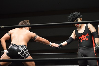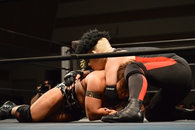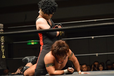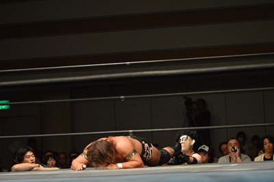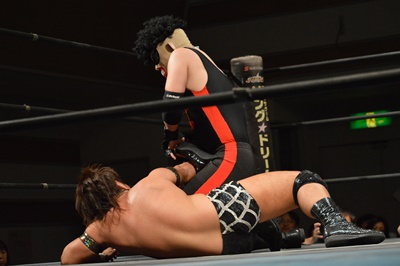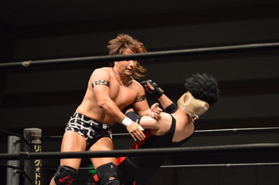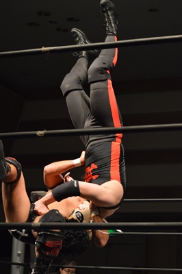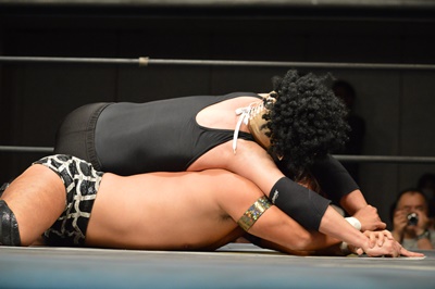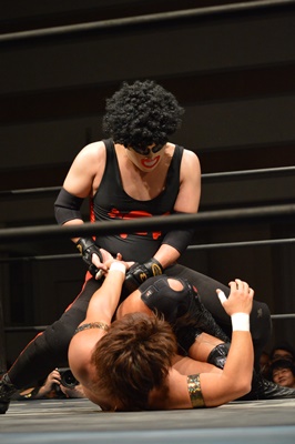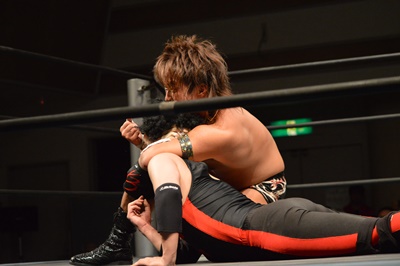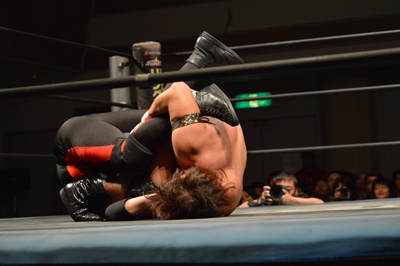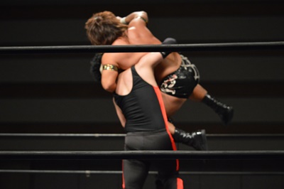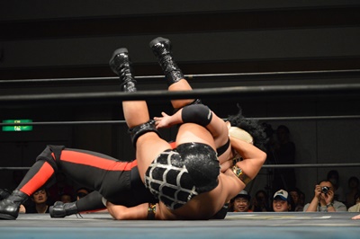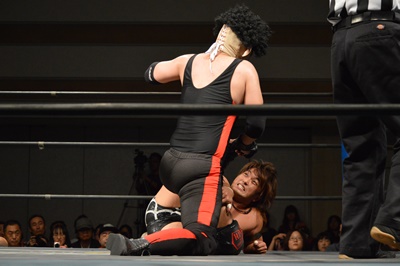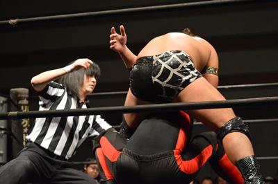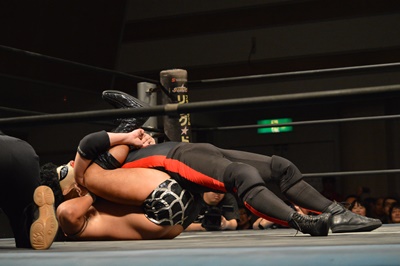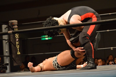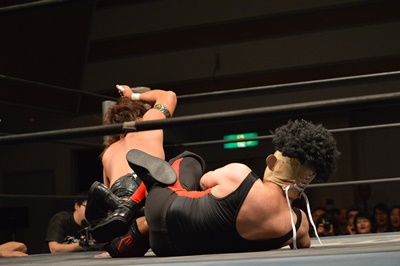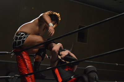 三富ヘッドロック(右写真)、ゴローJrロープに振ろうとするが振らせない。ゴローJr切り返してヘッドロックからフライングメイヤー、三富ヘッドシザーズでブレーク。