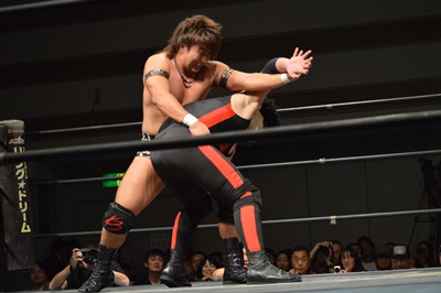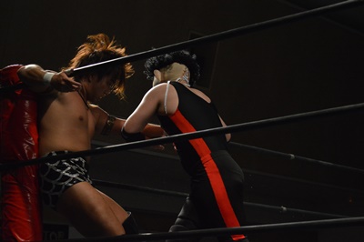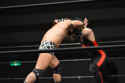 ロックアップ(右写真)、三富が腕を取る、ゴローJr切り返す、ブレーク。