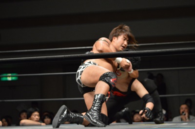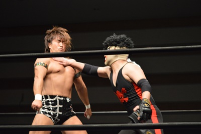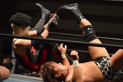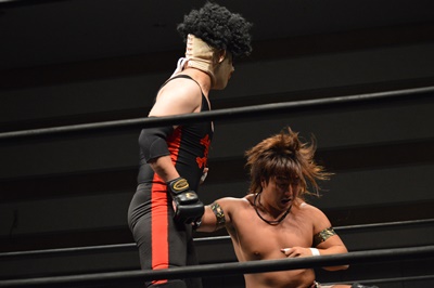 三富フライングメイヤー、ゴローJrエビ固めに、ノーカウント。ゴローJr立ち上がってロープに振る、三富ショルダーブロック(左写真)。