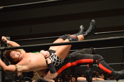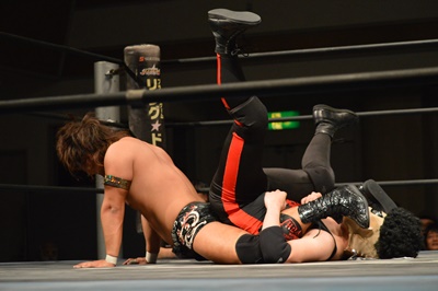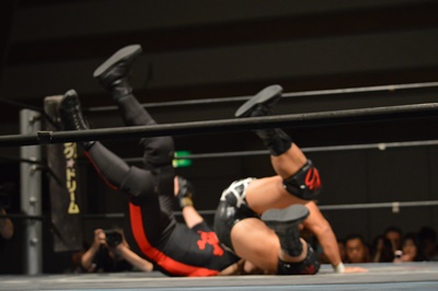 ゴローJrロープに飛ぶ、三富カウンターのフライングメイヤー(右写真)、ゴローJrエビ固め、カウント2。