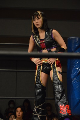 美央ハイキック、カウント2。ロープに飛ぶ、石川追走してニーリフト(左写真)。