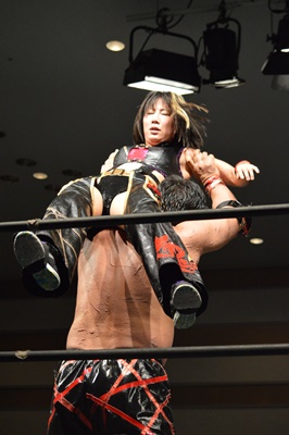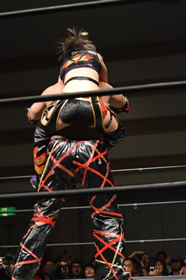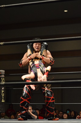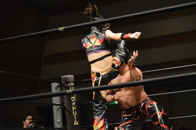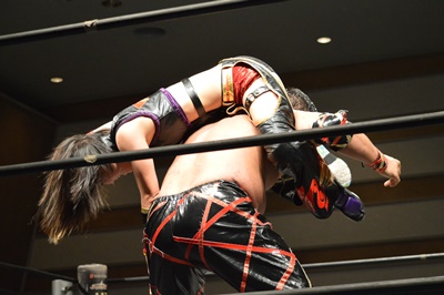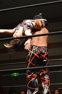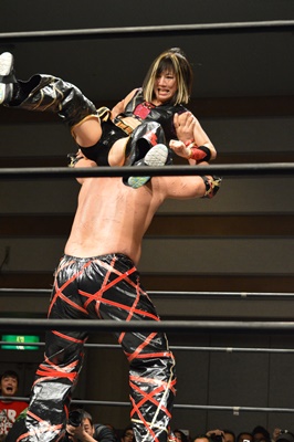 美央リバースフランケンシュタイナーに行くが石川転がらない(右写真)。