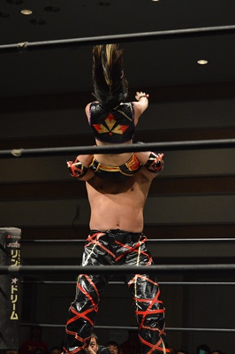 コーナーに上ってミサイルキック(左写真)、カウント2。
