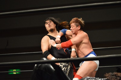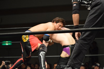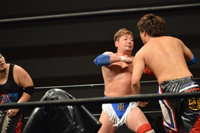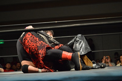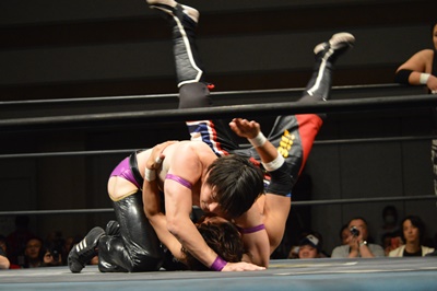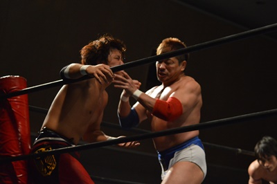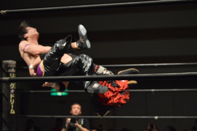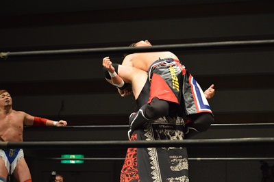 SAGATを踏み台にして高角度の串刺しドロップキック(右写真)。SAGATがサモアンスープレックス、カウント2。10分経過。