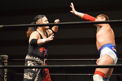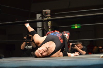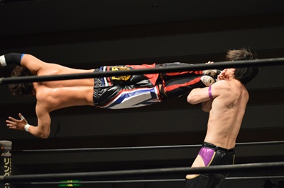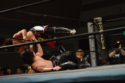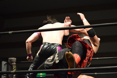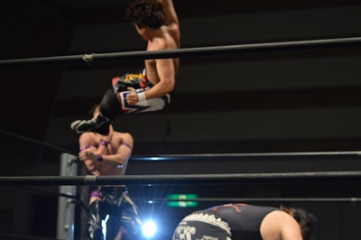 風戸エルボー、ロープに振ってドロップキック(左写真)、カウント2。