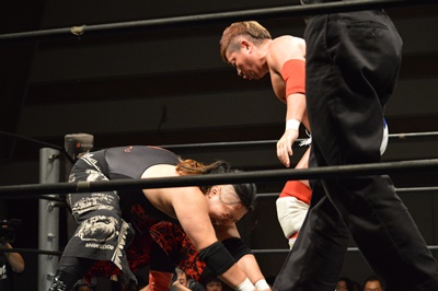ブリッジでフォールに行くが(左写真)2人ともカウント1で返される。