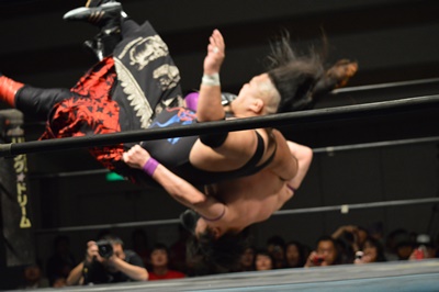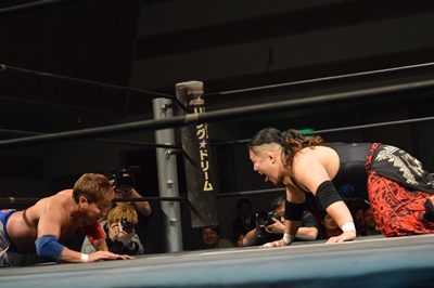 円華突っ込んで来た風戸を場外に落とす(右写真)。テイオーが場外でエルボー。