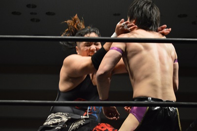 円華ロープに振る、風戸ジャンピングクローズライン(右写真)、SAGATにタッチ。