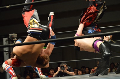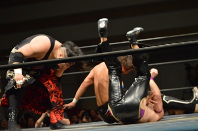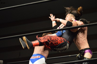円華腕取ってハンマーロックからヘッドロック、フライングメイヤー(左写真)、風戸ヘッドシザーズでブレーク。両軍タッチ。