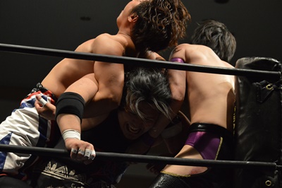 SAGATヘッドロック、テイオーロープに振る、SAGATショルダーブロック(左写真)。