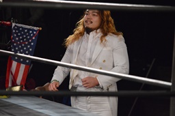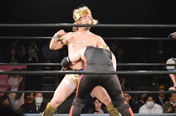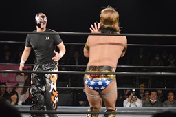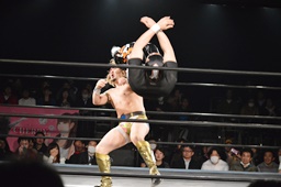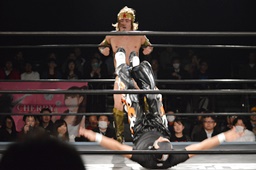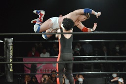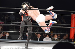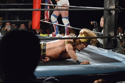 テイオーコーナーに上るとフライングボディアタック(左写真)、カウント3。