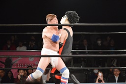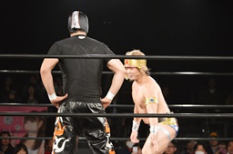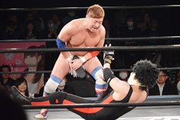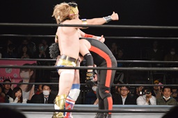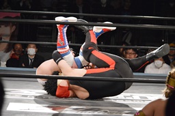 ロープワークから大地がアームドラッグ(右写真)、
