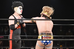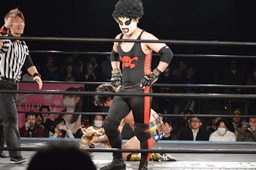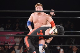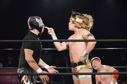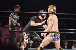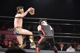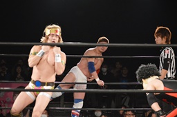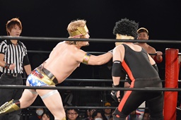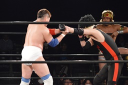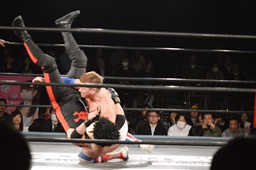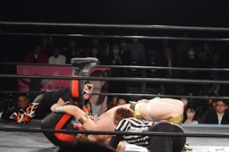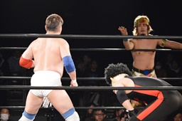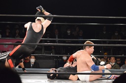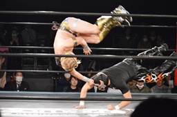 テイオーはゴローJrにパワースラム(左写真)、大地がエルボードロップでカットに、テイオーかわしてゴローJrに誤爆させる。