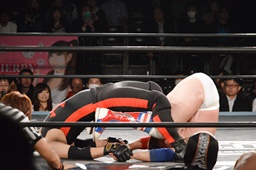 大地エルボースタッブ、三代目は転がって場外エスケープ(左写真)。大地リングに戻してゴローJrにタッチ。