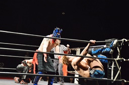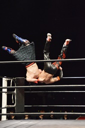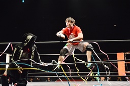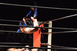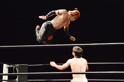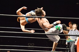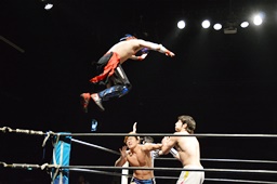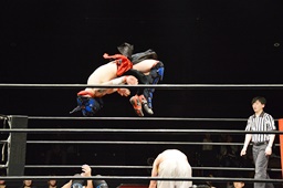 イサミコーナーに上ってダイビングクロスボディ(右写真)。