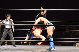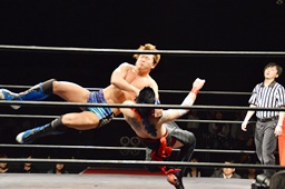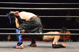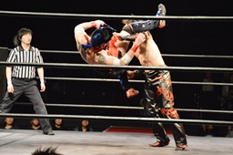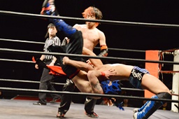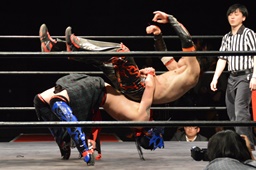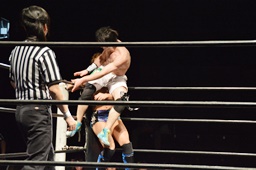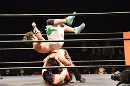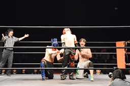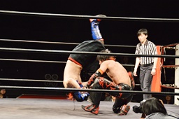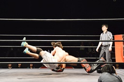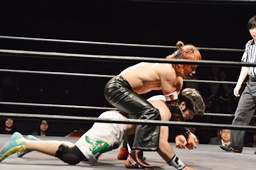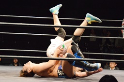 遠藤モンターニャにローキック、ノーザンライトスープレックスホールド(左写真)、カウント2。イサミにタッチ。